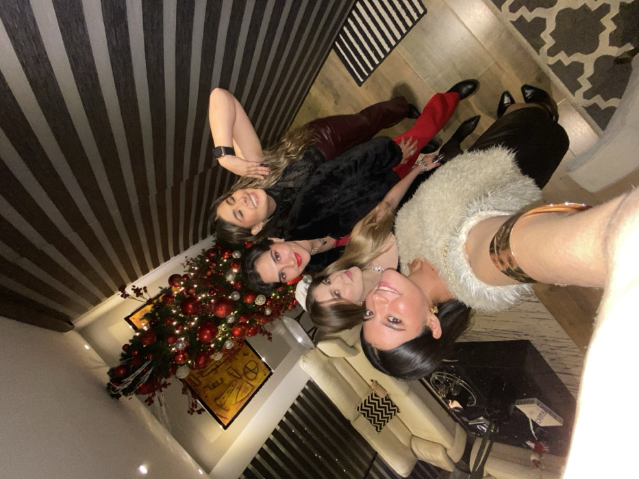 A group of four women lies together, taking a selfie near a Christmas tree decorated with red ornaments. The woman in the foreground wears a furry jacket and several bracelets. Behind her are two women in black tops and dresses, and a younger girl with blonde hair. Their legs and feet extend out toward the corner. The room has striped wallpaper and dark furniture. A black and white patterned rug is visible near the top corner.