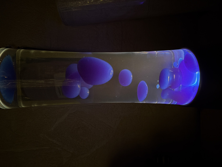 - "A horizontally-oriented lava lamp glows with purple wax globules suspended in a clear liquid inside a cylindrical glass container" by FM-48OzO2, licensed under CC BY 4.0