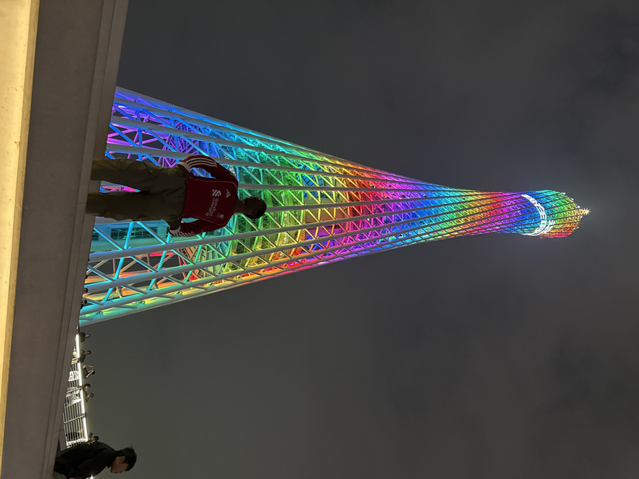 The image displays the Canton Tower at night in Haizhu District, Guangzhou, China. The tower is prominently illuminated with a spiraling rainbow spectrum of colors, transitioning from red at the base through orange, yellow, green, blue, and violet towards its upper sections, set against a dark, overcast sky. In the immediate foreground, a male individual with dark skin stands on a light-colored concrete ledge, seen from behind and slightly to the left. He wears a red long-sleeved shirt featuring white stripes on the sleeves and a "Standard Chartered" logo, paired with olive-green cargo pants. His hands are positioned on his hips, and his head is tilted upwards, observing the illuminated tower. To the right and further back, another male figure is seated on a lower concrete barrier, clad in a dark jacket. Beyond these individuals, a group of indistinct figures is visible on a recessed platform, also appearing to view the tower. The setting is an outdoor urban viewing area.