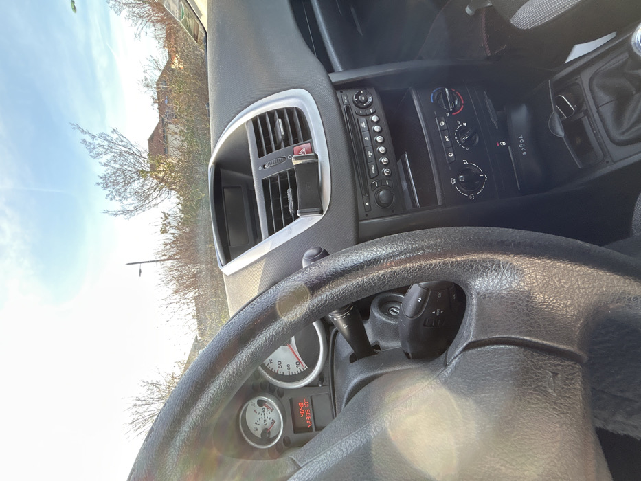 The image depicts the interior of a vehicle, specifically from the driver's perspective, looking forward through the windshield. The vehicle appears to be a Peugeot 207, based on the dashboard design. The time of day is sunny, indicated by bright sunlight causing glare on the windshield and interior surfaces, and a clear blue sky is visible. In the foreground, the black, textured steering wheel occupies the left side of the frame, showing signs of wear. Behind it, the instrument cluster is partially visible, displaying two white-faced gauges. A digital readout below the left gauge shows "4648" and "123351.0", likely indicating time and odometer mileage, respectively. The ignition keyhole and a control stalk are visible on the steering column. The dashboard is black with a central silver-trimmed bezel surrounding an upper blank display recess and two horizontal air vents. A black mobile phone holder is clipped into the central air vents, and a red triangular hazard light button is present. Below this, the vehicle's audio system features a series of buttons and a small screen. Further down, the climate control panel includes three rotary dials for temperature, fan speed, and air distribution, along with additional buttons. A black case labeled "VOGUE" is positioned in a storage compartment below the climate controls. The top of a black gear shifter boot is visible in the lower right corner. A portion of a grey, patterned fabric seat is visible on the far right. The exterior view through the windshield reveals a residential or semi-rural environment. Bare trees and dense bushes suggest late autumn or winter. Portions of light-colored buildings with red-tiled roofs are visible through the vegetation. A black streetlight pole stands in the middle-left background. While the image is stated to be from Veauche, France, no specific identifying landmarks or signs are visible within the frame to precisely determine the location within the city.