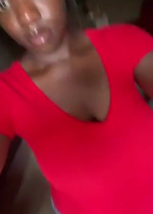 dark-skinned woman wearing a red V-neck shirt and denim shorts. She is inside a room, and it appears she is touching her stomach with her hand. The camera angle is slightly downward, focusing on her upper body.
