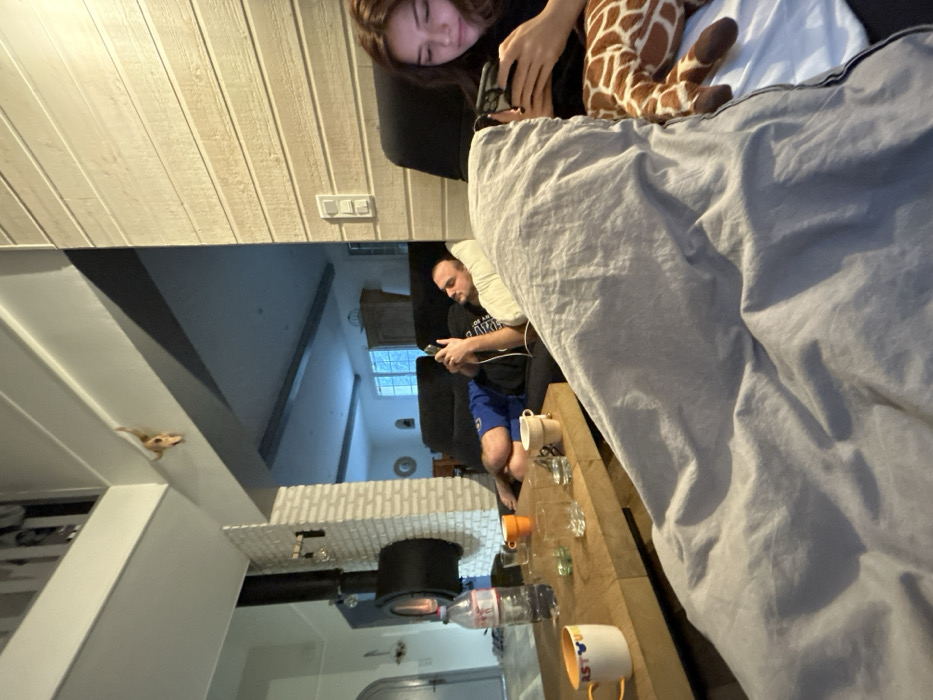 This image depicts an indoor domestic scene, specifically a living room or common area, located in Saint-Galmier, France. The perspective is from a third individual, partially obscured by a light grey blanket covering the lower left foreground. To the right, a female with long brown hair is seated on a dark sofa, wearing a dark top, and actively engaged with a black smartphone held in both hands. A stuffed giraffe animal, brown with dark spots, rests on the sofa next to her. The wall behind her is composed of light-colored horizontal wooden paneling, featuring a white electrical outlet or switch plate. In the center-left, a male with short dark hair and a beard is reclining on another dark sofa, supported by a white pillow. He is wearing a blue and black short-sleeved shirt and blue shorts. Like the female, he is focused on a black smartphone he holds, with a charging cable attached. His legs are visible, bent at the knees. Between the visible individuals, a light brown wooden coffee table holds several items: a white mug with a yellow handle and partial inscription "FIRST YU"; a clear plastic bottle of Volvic mineral water; three clear glasses, one appearing to contain a green liquid; an orange mug; and a light brown, possibly woven, mug. In the mid-background to the left, a black circular wood-burning stove with an upward-extending pipe is positioned against a partial wall of white-painted brickwork. Further left, an arched doorway is visible. Above the brickwork and stove, on a white structural beam or ledge, a small, light-colored, cat-like figure is perched. Through an architectural opening beyond the male, a brighter room is visible, featuring a large window that looks out onto trees or foliage, suggesting natural light entering the space during the day. Another dark sofa is partially visible in this distant background.