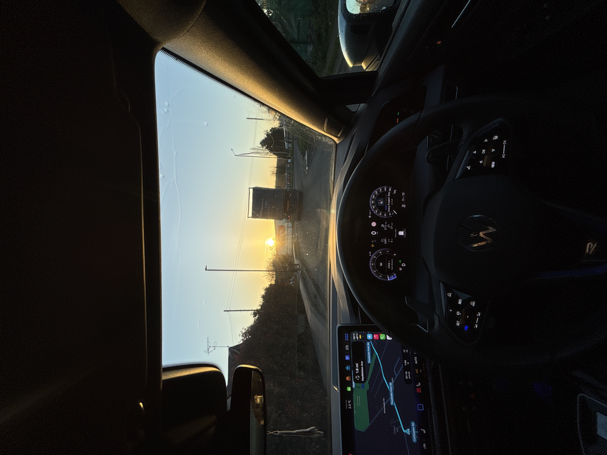 The scene depicts the interior of a Volkswagen vehicle from the driver's perspective, looking forward through the windshield at sunrise. The vehicle is on Theobalds Park Road in Enfield, Greater London, United Kingdom, specifically approaching an intersection with Myddelton Avenue and Cattlegate Road, as indicated by the active navigation system. The sun is low on the horizon, directly ahead, casting a bright glare and indicating early morning. The navigation screen shows an estimated arrival time of 07:15 and a current ambient temperature of 2.5°C. A large dark-colored truck is visible on the road ahead, positioned at or near an intersection. To the left, a residential-style building is partially obscured by dense hedges, with an antenna visible on its roof. Streetlights and power lines are visible in the distance. Inside the vehicle, the steering wheel, bearing the Volkswagen logo, is centered in the lower-middle frame. To the left of the steering wheel, a digital infotainment screen displays the navigation map and media information, showing "Every Freakin' Day" by Lil Durk playing. To the right of the steering wheel, a digital instrument cluster displays vehicle data, including a total distance of 4346 miles, a trip distance of 3 miles, an average speed of 27 mph, and the gear selector in 'D'. The rearview mirror is visible at the top-left, and parts of the dashboard and A-pillar are visible on the right. The windshield shows some water droplets or residue. No individuals are explicitly visible.