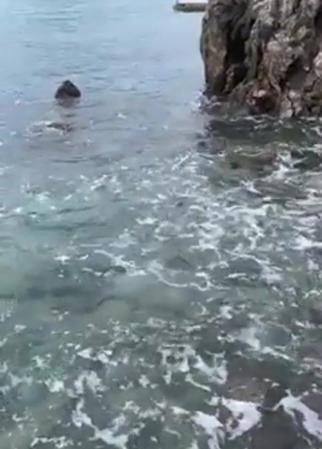 view of the sea near a rocky coastline, with a city visible in the background. The water is clear and the waves are gently lapping against the rocks. There are some dark rocks visible in the water near the shoreline. The overall scene is calm and peaceful.