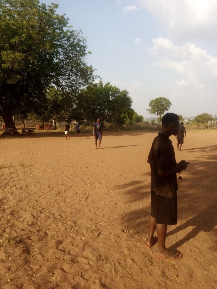 A dirt field under a partly cloudy sky shows several young men. One stands in the foreground, facing right, wearing a dark shirt and shorts with flip-flops, holding an object. Further back, others walk and stand in the middle of the field, wearing various shorts and t-shirts. Trees line the back and left edges of the field. A distant hill is visible. The light indicates it is daytime.