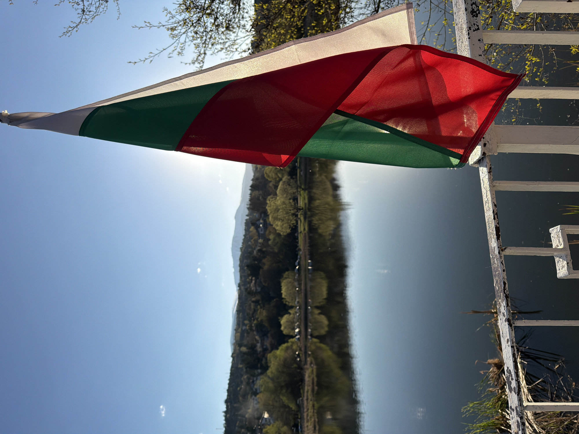 A Bulgarian flag is attached to a white, weathered metal fence. Behind the flag, the sun shines brightly, partially obscured by tree branches. The landscape is reflected in the still waters of a lake. In the background, a mountain range is visible. This scene depicts the landscape surrounding Kokalyane Lake, near Kokalyane, Bulgaria. The overall impression is that it's a bright, sunny day at the lakeside.