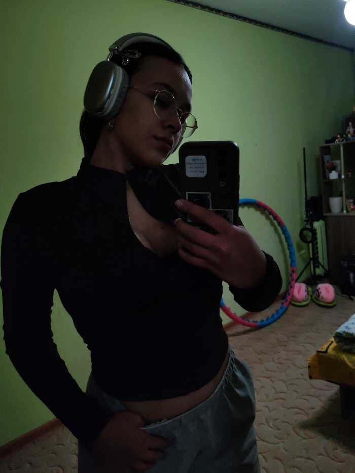 A young woman takes a selfie in a room with green walls. She wears headphones, glasses, and a black long-sleeved top with a small keyhole neckline. She also wears light gray sweatpants. Her phone partially obscures her face. In the background, there's a colorful hula hoop, a tripod, a small shelving unit with objects, and a patterned carpet. A light source is visible at the top right corner of the frame.