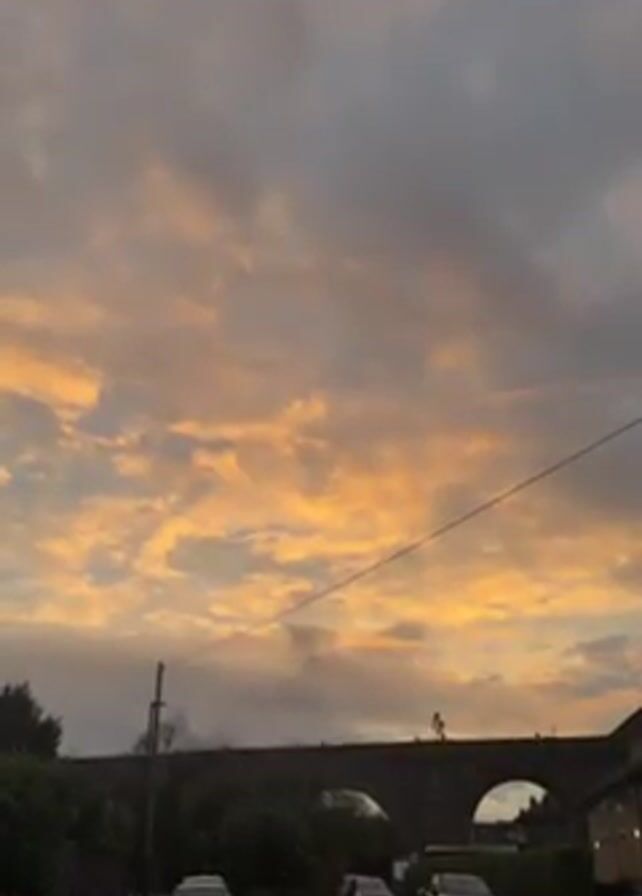 street with a bridge in the background, under a sky of mixed gray and orange clouds. There are three cars parked on the street. The bridge appears to be made of stone and has arches. Trees and bushes line the side of the road. A utility pole with a wire is visible. The lighting suggests it is either sunrise or sunset. The camera angle is from ground level, looking up the street towards the bridge and sky.