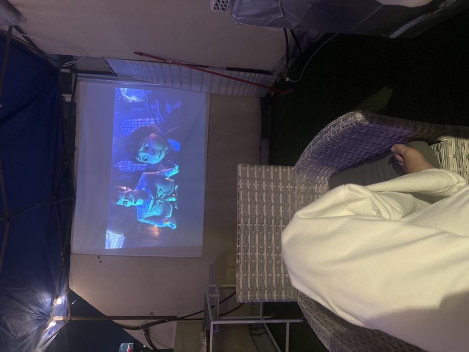 An outdoor movie night shows a cartoon projected on a wall. A person in a white robe sits in a wicker chair, foot visible. A small table sits beside the chair. Above, a tent roof slopes down. Adjacent to the wall, green turf is present. A red pole leans against the wall above the screen. Other outdoor items include a white box and a small string of lights.
