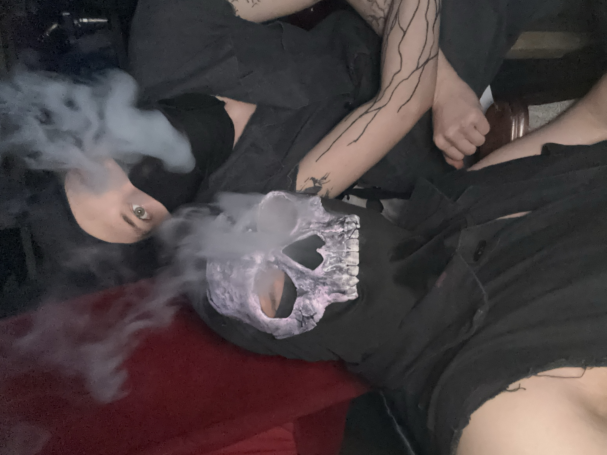 A person with a skull mask lies on a red surface, possibly a couch or bed. They are surrounded by grey smoke. Another person is visible in the background, lying with their arms crossed, displaying tattoos on their arms. They are wearing dark clothing. The environment is dimly lit and the location cannot be determined from the image.