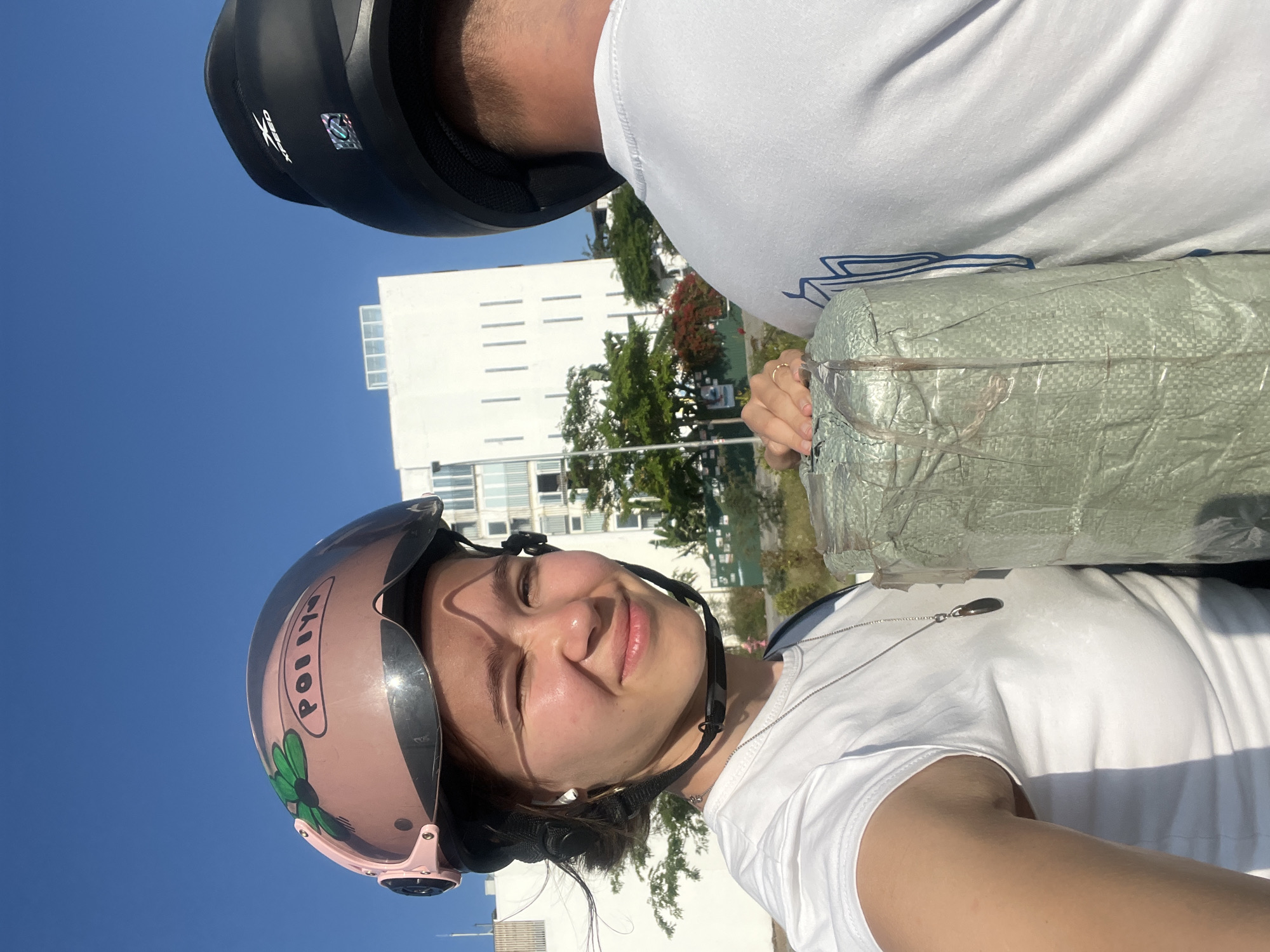 Two people on a moped, with a large wrapped object between them. The person in the foreground is wearing a pink helmet with a clover and the name "Polly" on it. The other person is wearing a black helmet. Both are wearing white shirts. Behind them is a white building with multiple windows, trees, and a clear blue sky. The location is the city of Nam Nha Trang, Vietnam.