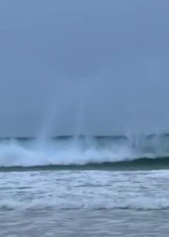 beach scene with rough waves under an overcast sky. Initially, the video focuses on the large, foamy waves breaking onto the shore. Then, two surfers appear, sitting on their boards and facing away from the camera, riding the waves.