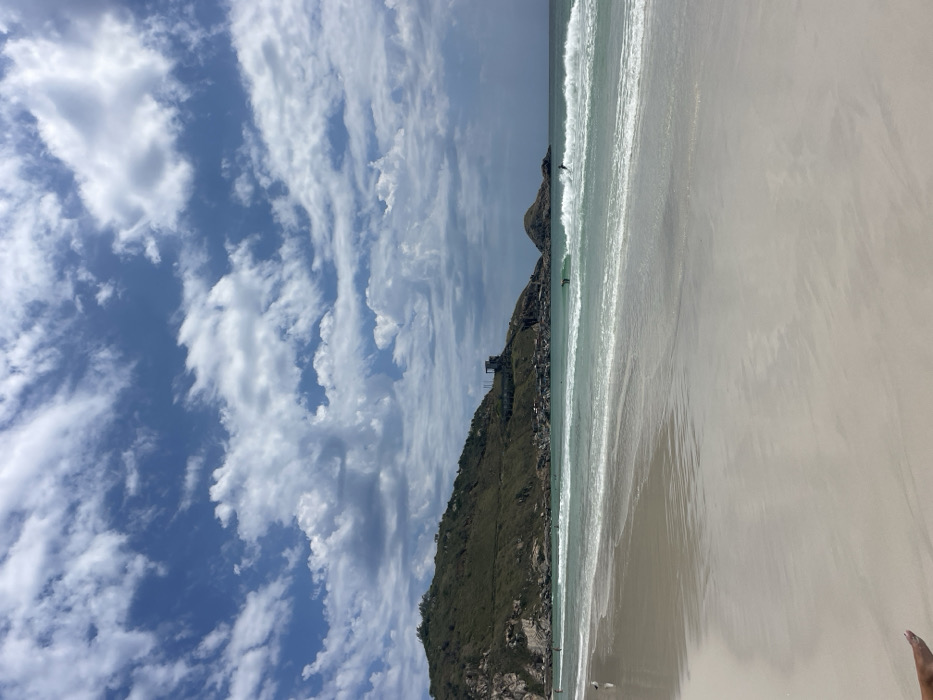 A picturesque beach scene unfolds under a vibrant blue sky dotted with fluffy white clouds