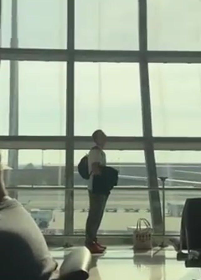 A person in grey pants, a white shirt, and a backpack is standing facing a window in what appears to be an airport. The window shows an airport runway with planes. A person walks by on the left of the frame, pulling a bag and carrying a tote bag. There are seated people in the foreground on either side of the frame, but they are largely obscured.