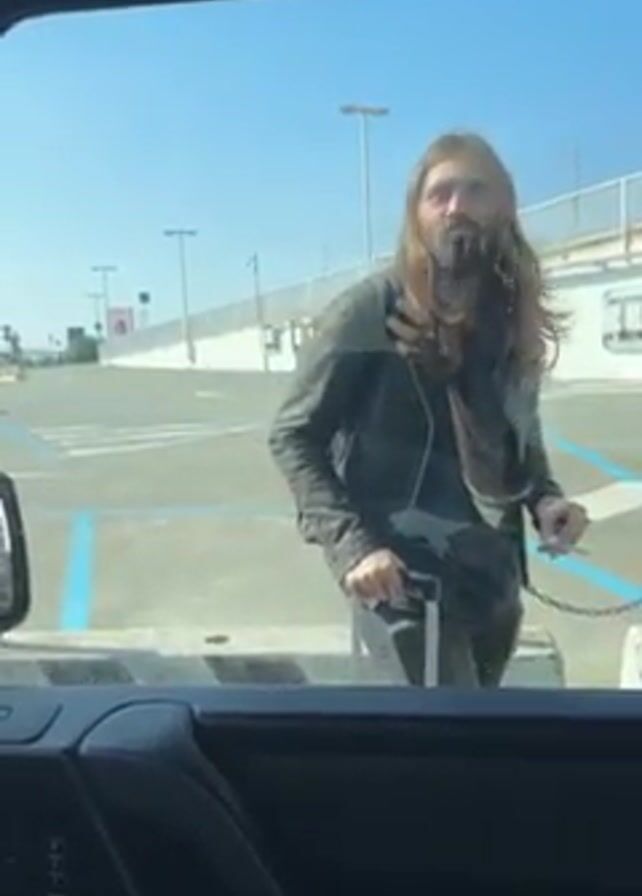 person with long hair and a beard, wearing a black leather jacket, standing outside of a car in a parking lot. The person is holding the handle of a suitcase. The parking lot appears to be at an airport with light poles and a pedestrian bridge visible in the background. The person outside the car makes a gesture with their fist pointed towards the car. The car is partially visible, showing a black dashboard and a portion of the window frame. The sky is blue and sunny.