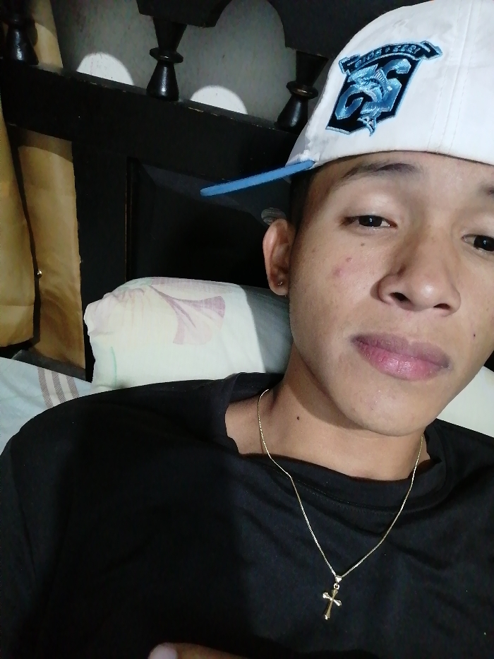 A person wearing a white baseball cap with a blue logo and a black t-shirt looks at the camera. They have short, dark hair and are wearing a gold chain with a cross pendant. The background includes a bed with pillows and a dark headboard with decorative elements. The image appears to be taken in a room with soft lighting.