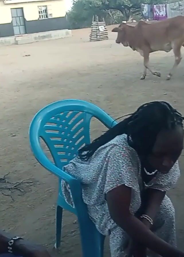 daytime outdoor scene in a rural setting. Three individuals are visible, two seated on blue plastic chairs and one working on another person's leg. The woman in the patterned dress is seated looking down while another woman in an orange patterned shirt works on her lower leg and foot with what appears to be soap and water. An older man sits on a chair to the left of the scene. In the background, a cow is walking in the open space and there are chickens and other animals in the area. Several buildings are visible. Some clothing is on a clothesline in the background. The ground is sandy.