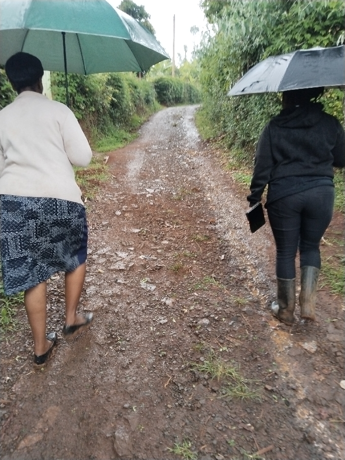 In Karuiro, Kenya, two individuals walk away from the camera along a muddy, unpaved dirt path under overcast conditions