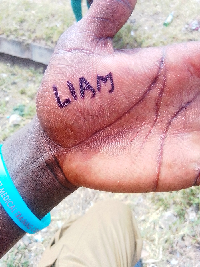 An open, dark-skinned hand features the name "LIAM" written in dark marker ink across the palm