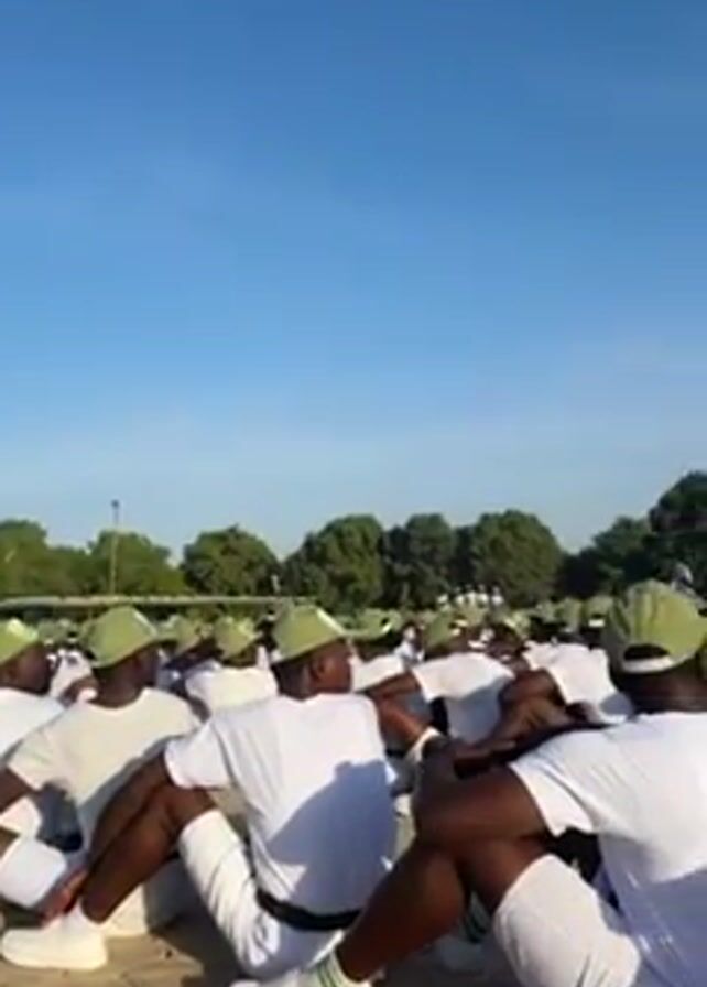 A group of people in white uniforms and light green hats sit on the ground, closely arranged. They sit on a paved surface that is a geometric pattern of blocks, and each person is leaning back on their hands with their knees bent. A light blue sky can be seen in the background. Trees dot the horizon. Some buildings and a red structure can also be seen in the distance. One person turns and looks directly at the camera. The camera pans up and to the right, following the rows of people.