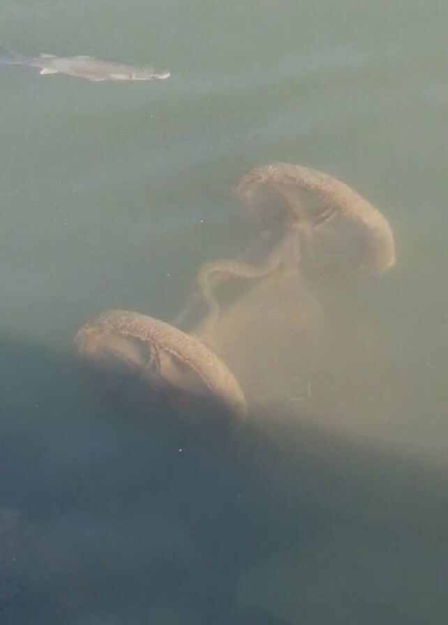 murky body of water. Two jellyfish are visible, partially submerged. Several small fish swim above them. The camera is stationary.