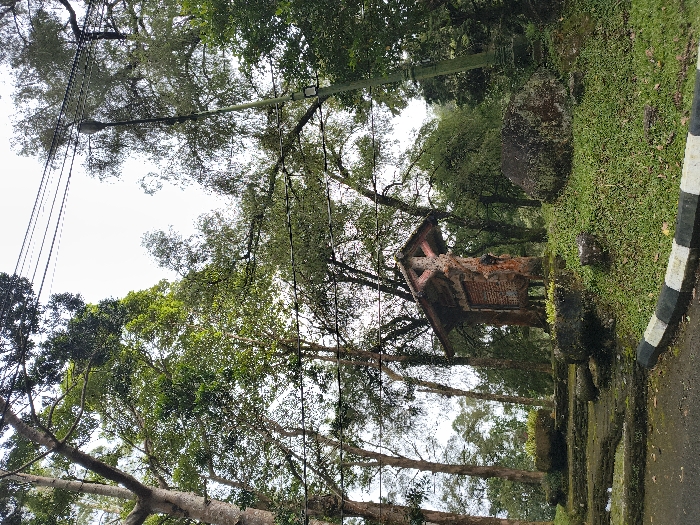 A small, weathered brick structure stands beneath a canopy of trees next to a paved road. The structure is accented with a cross on top. A large boulder covered in greenery sits nearby. Utility lines and a street light extend across the top of the frame. The scene appears lush and overgrown.
