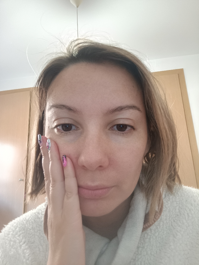 An adult female is depicted indoors, looking directly at the camera. She has medium-length light brown hair and fair skin with visible freckles. Her left hand, adorned with multi-colored nail polish displaying pink, black, white, and blue/purple patterns, rests against her lower left cheek and jawline. She is wearing a light-colored, textured garment, resembling fleece or sherpa. The background consists of a plain white wall, a white ceiling with a simple white circular ceiling lamp in the upper center, a light-toned wooden wardrobe or cabinet partially visible on the left, and a wooden door frame edge on the right. The scene is located in Sagunto, Spain.