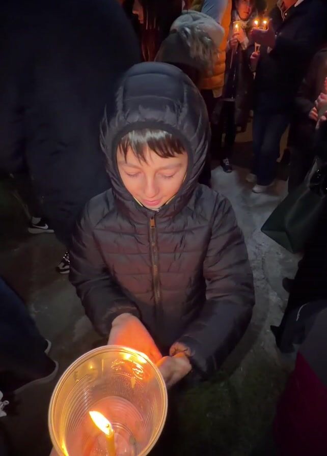 A young boy in a black hooded puffer jacket is holding a lit candle in a plastic cup. The camera focuses on the candle, then shifts to the boy's face, and then zooms in on the flame being transferred to his hands. The camera then focuses on the boy's jacket. The scene appears to be outdoors and it is dark, with other people holding candles in the background.
