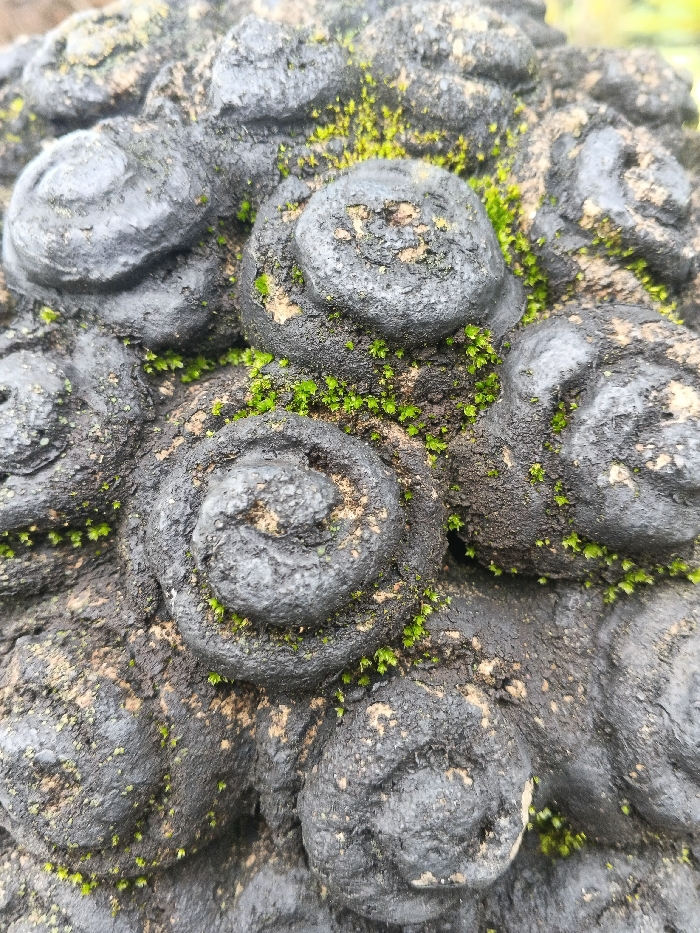 Black, bulbous, patterned structures cluster together, possibly stone or concrete. Each element features a spiral or whorled design. Patches of vibrant green moss grow between these structures, adding a touch of life and contrast. The rough texture of the material and the presence of moss suggest age or prolonged exposure to the elements.