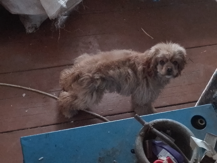 - "The image displays a small, light brown dog with shaggy fur, possibly a Cavalier King Charles Spaniel or similar breed, standing on a dark brown wooden plank floor" by FM-zZnPi1, licensed under CC BY 4.0
