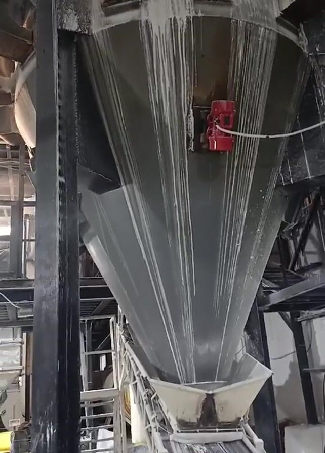 interior of what appears to be a factory or industrial facility. The primary focus is on a large, conical hopper or funnel-shaped structure, covered with white residue. A conveyor belt runs below it, collecting material from the hopper. The structure is supported by black metal beams. In the background, workers are visible in a wide-open room with multiple levels. They are moving around yellow bags, possibly filled with a material related to the production process. Some workers are wearing masks. The floor is covered in a layer of the same white residue as the hopper. Other industrial equipment is also visible in the background.