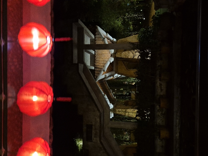 The image displays an outdoor night scene featuring traditional Vietnamese architecture and decorative lighting