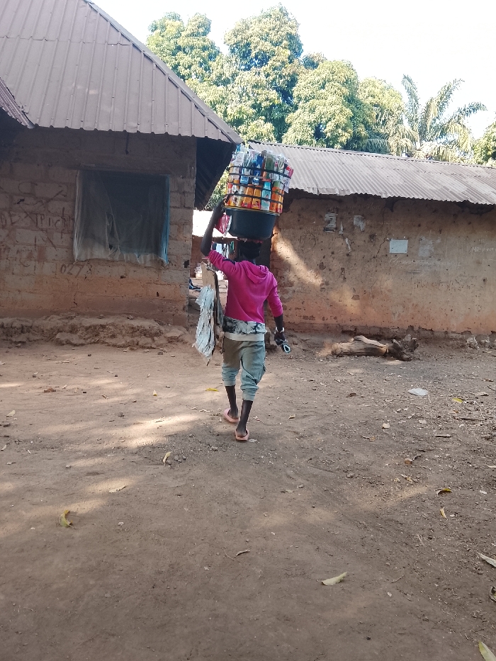 The image depicts an individual walking away from the camera on an unpaved dirt path in Akwanga, Nigeria. The person is dressed in a pink long-sleeved top, light-colored cropped trousers, and light-colored sandals. A dark, round container filled with a multi-tiered stack of various packaged goods is balanced on their head. A light-colored bag is carried on the individual's left side, and a dark object is held in their right hand. To the left, a single-story building constructed of light-colored, possibly mud-brick, walls with a corrugated metal roof is visible. This building features a rectangular window opening covered by light-colored fabric and exhibits multiple markings and graffiti, including the numbers "273." To the right, a second single-story building with an earthen wall and a corrugated metal roof is partially visible further back. The ground is reddish-brown dirt, with sparse vegetation and scattered small debris. Lush green trees dominate the background behind the structures, beneath a clear, light blue sky. Sunlight illuminates the scene, casting shadows on the path.