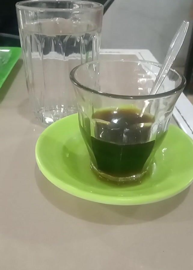 Two clear glasses sit on a table. One is empty. The other contains a dark green liquid and rests on a light green saucer. A clear plastic spoon is inside the glass. A person is partially visible in the background.