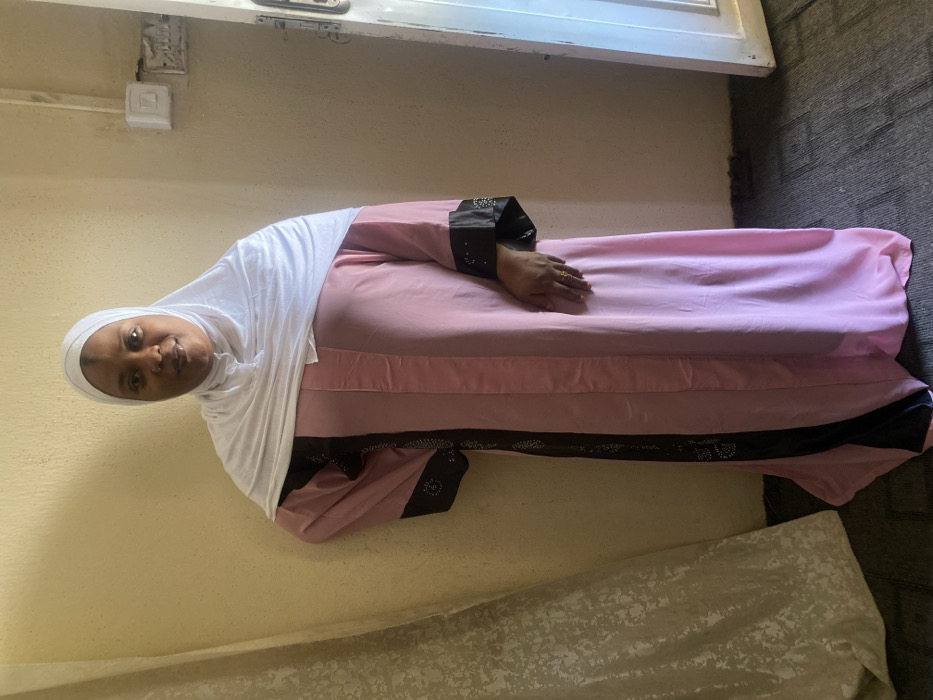 A dark-skinned female individual stands centrally, facing forward, in an indoor setting identified as Hotoro South, Nigeria. She wears a full-length, light pink garment, likely an abaya, featuring black vertical panels on each side with subtle embellishments, and a white hijab covering her head. Her left arm is bent, with her hand resting on her left hip. Her right arm hangs at her side, with her hand positioned over her lower abdomen; a simple gold-colored ring is visible on her right ring finger. The background consists of a plain, light beige wall. To the subject's left, a textured, light-colored curtain is partially visible. To her right, a white door frame is evident, along with a white electrical switch panel mounted on the wall. The floor is covered with a dark grey, possibly carpeted or tiled, material.