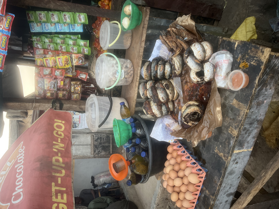 A street market stall is packed with diverse goods. Shelves are stocked with sachets of spices and snacks. Clear buckets contain peanuts, onions, and tomatoes. A black pail holds bottles of oil and green containers. A tray of brown eggs rests beside the pail. Smoked fish and some sealed bags are placed on a weathered wooden surface. A sign with "Chocolate" and "GET-UP-'N-GO!" is visible.