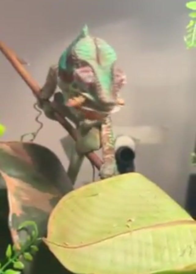 A close-up shot shows a chameleon clinging to a thin branch, positioned above a broad green leaf. The chameleon has a predominantly green body with mottled patches of red and brown. Its eyes are independently focused, one looking towards the camera. The background is a plain white surface. The surrounding environment includes other artificial plants.