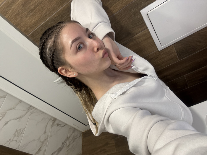 A young adult female is depicted in a close-up, angled indoor selfie. She has light skin, blue eyes, and her hair is styled in dark cornrow braids leading into lighter blonde/brown braids. A small white stud earring is visible in her left ear, and a white object, possibly a hair clip, is lodged in her braids near her ear. She wears a light-colored, possibly white or light grey, hooded sweatshirt with a partially unzipped front, revealing a fleece lining. Her left hand, with manicured nails painted light purple and a ring on one finger, is positioned near her chin, with her lips forming a slight pout. The background consists of a wall with white marble-patterned tiles on the lower section and a plain white surface above, possibly a ceiling. A white door frame is visible on the left. The floor is covered with dark brown, wood-look tiles, featuring a white rectangular access panel or vent. The scene takes place within an interior setting in the city of Yambol, Bulgaria.