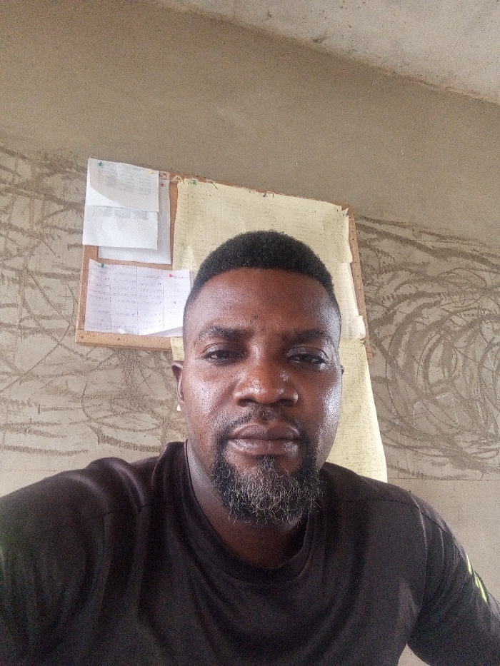 An adult male, approximately 30-45 years old, of African descent, is centered in the frame, looking directly at the camera
