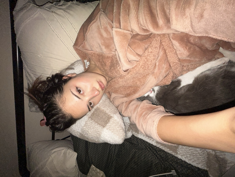A young woman with dark hair lies on a bed. She rests on a patterned pillow beneath a plush, hooded, coral-colored robe. A gray and white cat nestles beside her. The woman's face is partially illuminated, revealing her brown eyes and dark eyebrows. The bedding is mostly white and cream, while the bedframe is dark. The photo appears to be taken from a slightly elevated, angled perspective.