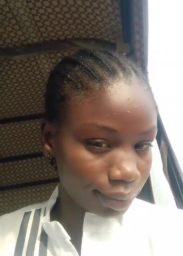 A young woman with braided hair and wearing a white jacket with gray stripes is looking at the camera. The camera is focused on her face and upper body. She appears to be in a vehicle with a checkered pattern ceiling. The background is blurry and light.