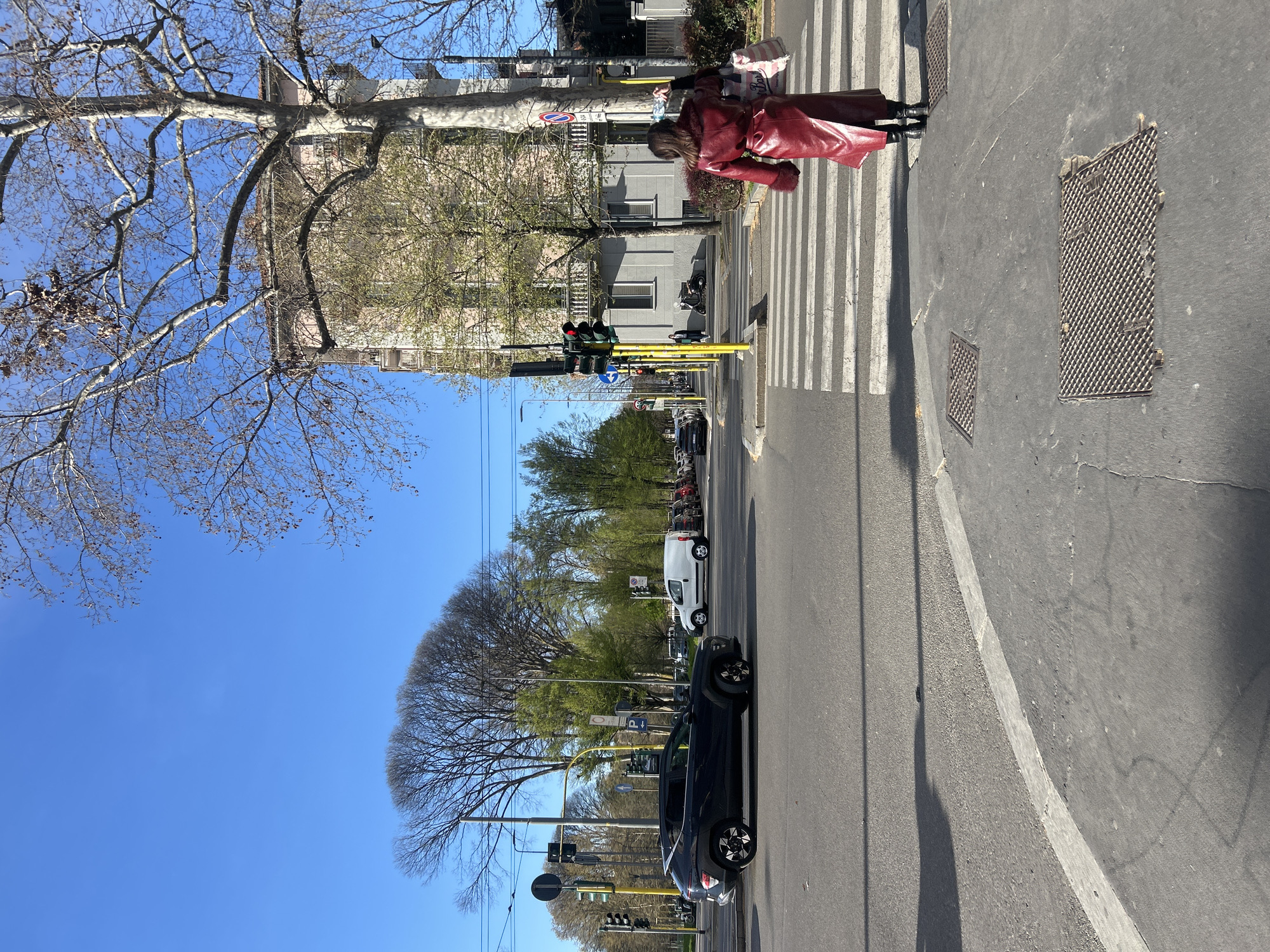 The image depicts an urban intersection in Milan, Italy, specifically Piazzale Principessa Clotilde, looking towards Corso di Porta Nuova and Via Luigi Settembrini. The scene unfolds on a clear, sunny day, with a bright blue sky overhead and strong shadows indicating direct sunlight. In the foreground, a person is observed from behind, standing on the paved corner of a sidewalk, adjacent to a zebra-striped pedestrian crossing. The individual is dressed in a long, dark red, possibly leather or vinyl, belted coat featuring a faux fur collar and cuffs. Black boots are visible below the coat hem. In their left hand, they carry several light-colored shopping bags. Three rectangular metal utility covers are visible on the concrete pavement near their feet. An asphalt road occupies the mid-ground, where a dark-colored SUV, identifiable as a Hyundai Kona Electric, is in motion, driving from left to right across the intersection. Further down the street on the left, a white delivery van is visible amidst other parked or moving vehicles. Multiple yellow poles support traffic lights, with one prominent set in the mid-ground displaying a red signal. Overhead wires, likely for public transport like trams, crisscross the sky. On the right side of the image, a multi-story building forms the corner of the intersection. Its upper floors are a light pink hue, while the ground floor is grey, featuring windows and balconies. A large, bare-branched deciduous tree with mottled bark partially obscures the building. Low green shrubs are planted along the building's base. The left background features a wide avenue lined with numerous trees, some still bare and others exhibiting nascent light green foliage, indicating an early spring season. Distant figures, including one near a parked scooter, are visible across the intersection.