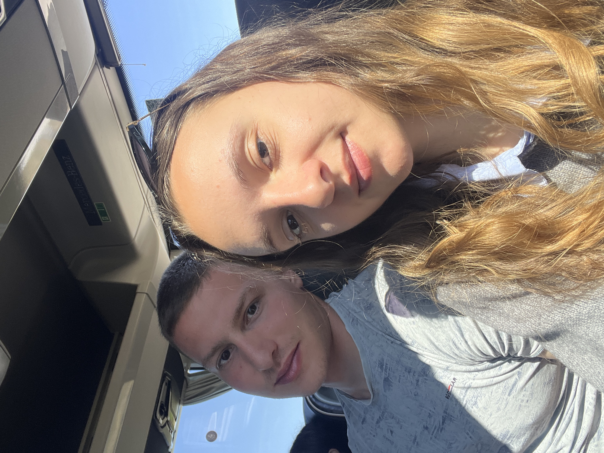 The image depicts two young adult individuals inside a Mercedes-Benz coach or bus, located in Otero de Herreros, Spain. The female on the right, with long light brown hair, wears a light collared shirt under a grey knitted garment and has black-framed sunglasses perched on her head. She is holding the camera, taking a selfie. The male on the left, with short dark hair, wears a light grey patterned short-sleeved t-shirt with a partially visible red logo. Both individuals are looking towards the camera with slight smiles. Bright daylight enters from the right, casting shadows on the male's shirt and face. A clear blue sky is visible through the window on the left side of the vehicle. The interior includes a light-colored overhead compartment with a "Mercedes-Benz" label and a green indicator light.