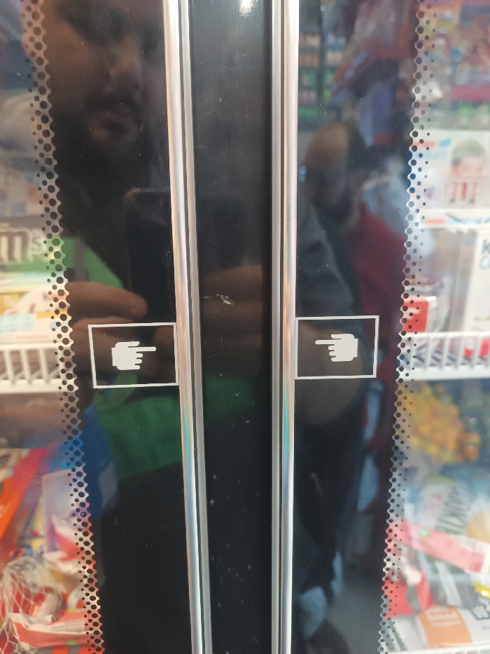 The image presents a close-up view of two reflective glass doors, likely from a commercial refrigeration or display unit, situated within a retail establishment in the city of Unknown, Unknown. Each door features a white square sticker with a stylized pointing hand icon, positioned towards the lower center. The doors are separated by a prominent silver-colored vertical frame. The reflective surface of the left door shows a partial reflection of a bearded individual wearing a green garment, holding a smartphone, consistent with the person taking the photograph. The right door reflects a second individual, partially visible, with a receding hairline or baldness, wearing a red top over a lighter shirt. Through the glass, shelves stocked with various packaged consumer goods are visible, consistent with a convenience store or grocery store setting. Partial branding elements such as "M&M's", "Kinder", and "KiK" are discernible on some packages. The glass surfaces exhibit minor smudges and dust.
