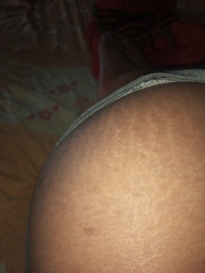 A close-up shot of a human thigh. The skin is tan and mottled with stretch marks running horizontally across the expanse. A gray waistband of clothing is visible at the top. In the blurred background, a leg and a patterned bedsheet can be seen. The overall lighting is low, with warm hues dominating the scene.