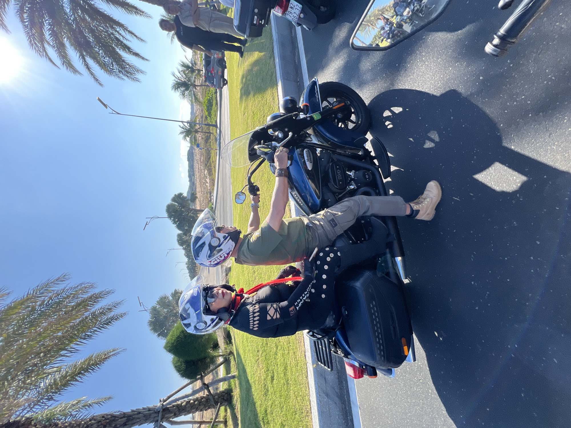 Two individuals are positioned on a dark blue Harley-Davidson "114" touring motorcycle on an asphalt road in Cam Ranh, Vietnam, under a clear blue sky with bright sunlight. The motorcycle is stationary or moving slowly, captured from the perspective of another vehicle ahead and to its right. The passenger, a female, is seated on the rear of the motorcycle. She wears a white and blue GIVI full-face helmet with a clear visor, dark sunglasses, a black form-fitting long-sleeved garment featuring perforated and cross-laced patterns on the sleeves and shoulders, and studded details on the lower body. A red scarf is draped around her neck. Her legs are positioned on the motorcycle's footrests. The driver, a male, is seated in front of the passenger, gripping the handlebars. He wears a matching white and blue GIVI full-face helmet with a clear visor, a short-sleeved green t-shirt, khaki cargo pants, and tan lace-up boots. The Harley-Davidson motorcycle features a clear windshield, chrome accents, and black hard-sided saddlebags. A partially visible black top box and the rear wheel of another motorcycle, displaying Vietnamese license plate "79-N2 062.32" (consistent with Khanh Hoa province, which includes Cam Ranh), are in the immediate foreground on the right. The environment includes a manicured green grassy median or roadside bordered by a concrete curb. Numerous palm trees line the road. In the background, beyond the grassy area, a dry, sandy landscape with sparse vegetation and additional palm trees is visible. Several streetlights are spaced along the road. To the right, on the grassy area, two men are standing near a dark grey SUV; one man wears a dark t-shirt and the other a light-colored shirt and pants. The sun is high, casting distinct shadows on the road surface.