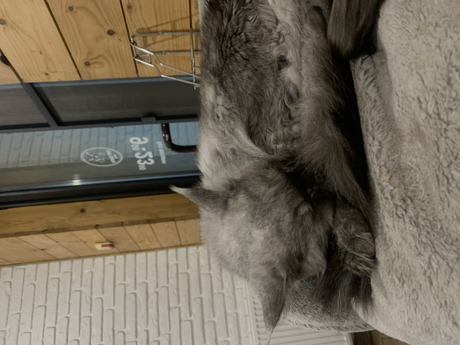 - "A medium-to-long-haired grey domestic cat is depicted sleeping, curled tightly on a grey plush surface" by FM-BI1Cp2, licensed under CC BY 4.0