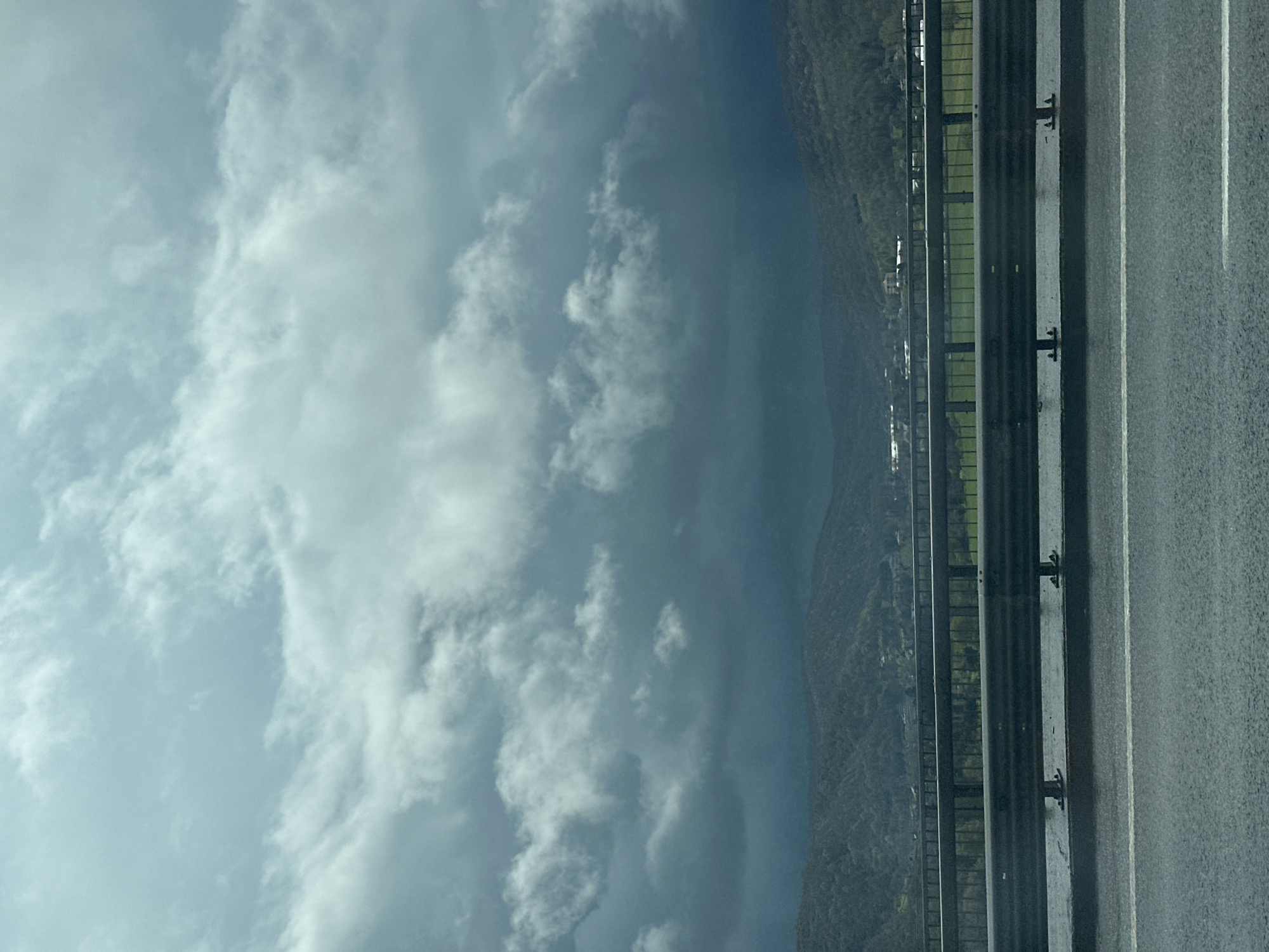 n elevated road, likely a highway or bridge, alongside a mountainous landscape with scattered buildings. The right side of the frame is dominated by the road surface, which appears wet, marked with white lane dividers. Adjacent to the road is a metal safety barrier. Beyond the barrier, a green, hilly landscape stretches into the distance, possibly overlooking a body of water. The sky is filled with numerous clouds, contributing to a partially overcast atmosphere. This scene likely overlooks the Beykoz area in Turkey, given its characteristic landscape where hills and mountains meet the water.