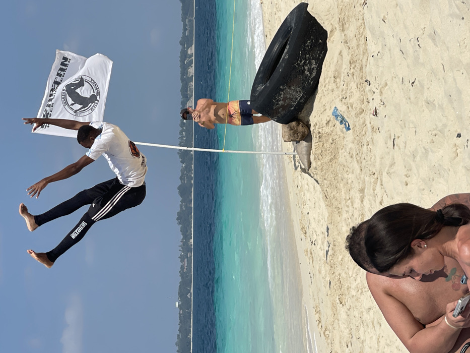 The scene depicts a sunny day on a sandy beach in Zanzibar, Tanzania, with a clear blue sky overhead. The ocean exhibits distinct bands of light turquoise near the shore, transitioning to a deeper blue further out, with minimal wave activity. A distant landmass, featuring scattered structures and vegetation, is visible on the horizon. In the upper midground, a dark-skinned male is captured mid-air, performing an acrobatic jump or flip. He wears a white t-shirt with a dark logo, black athletic pants with white stripes and visible "adidas" branding, and is barefoot. His arms are raised, and his legs are bent upwards. Directly below him, near the water's edge, a light-skinned male stands facing forward, wearing dark sunglasses and multi-colored swim trunks. He holds a black smartphone horizontally, appearing to record or photograph the airborne individual. To the left of the standing man, a white flag pole is anchored in the sand by a grey sandbag and a log. A white flag attached to the pole displays a dark logo featuring a stylized figure performing a backflip, along with text including "SPARTAN" and "NEVER QUIT NEVER SURRENDER." A large, worn black tire is partially buried in the sand next to the flag pole, and small pieces of blue plastic debris are present on the sand nearby. In the lower foreground, a light-skinned female with dark hair pulled back into a ponytail is partially visible, seated on the sand. She holds a white smartphone horizontally. Behind and to the left of her, a light-skinned male, largely obscured, is also seated on the sand, displaying a small red tattoo on his left shoulder.