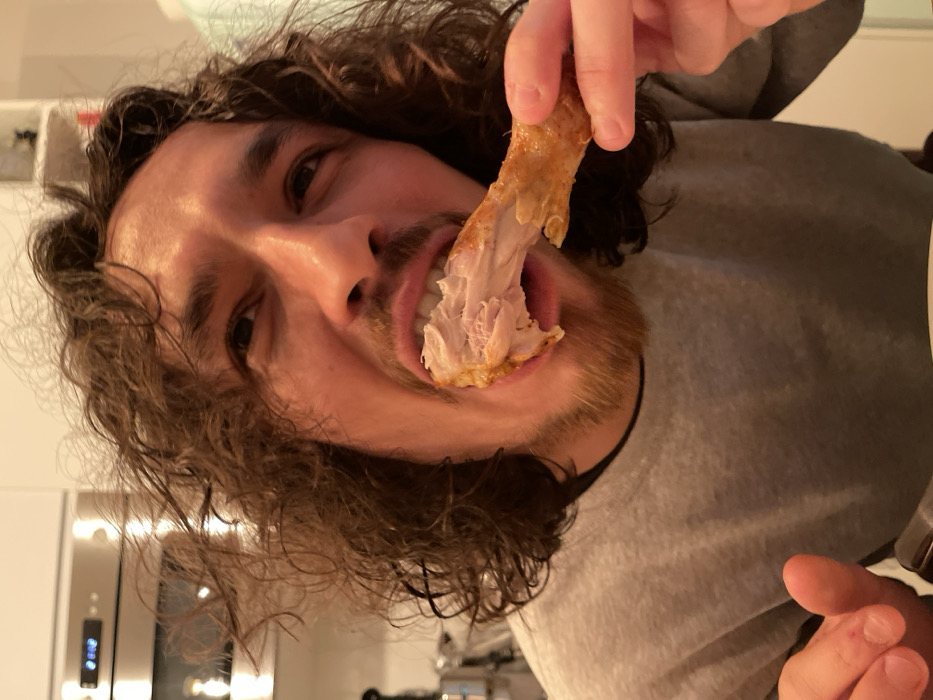 - "A man with long, curly brown hair and a beard takes a large bite of a cooked chicken leg" by FM-byZjc2, licensed under CC BY 4.0